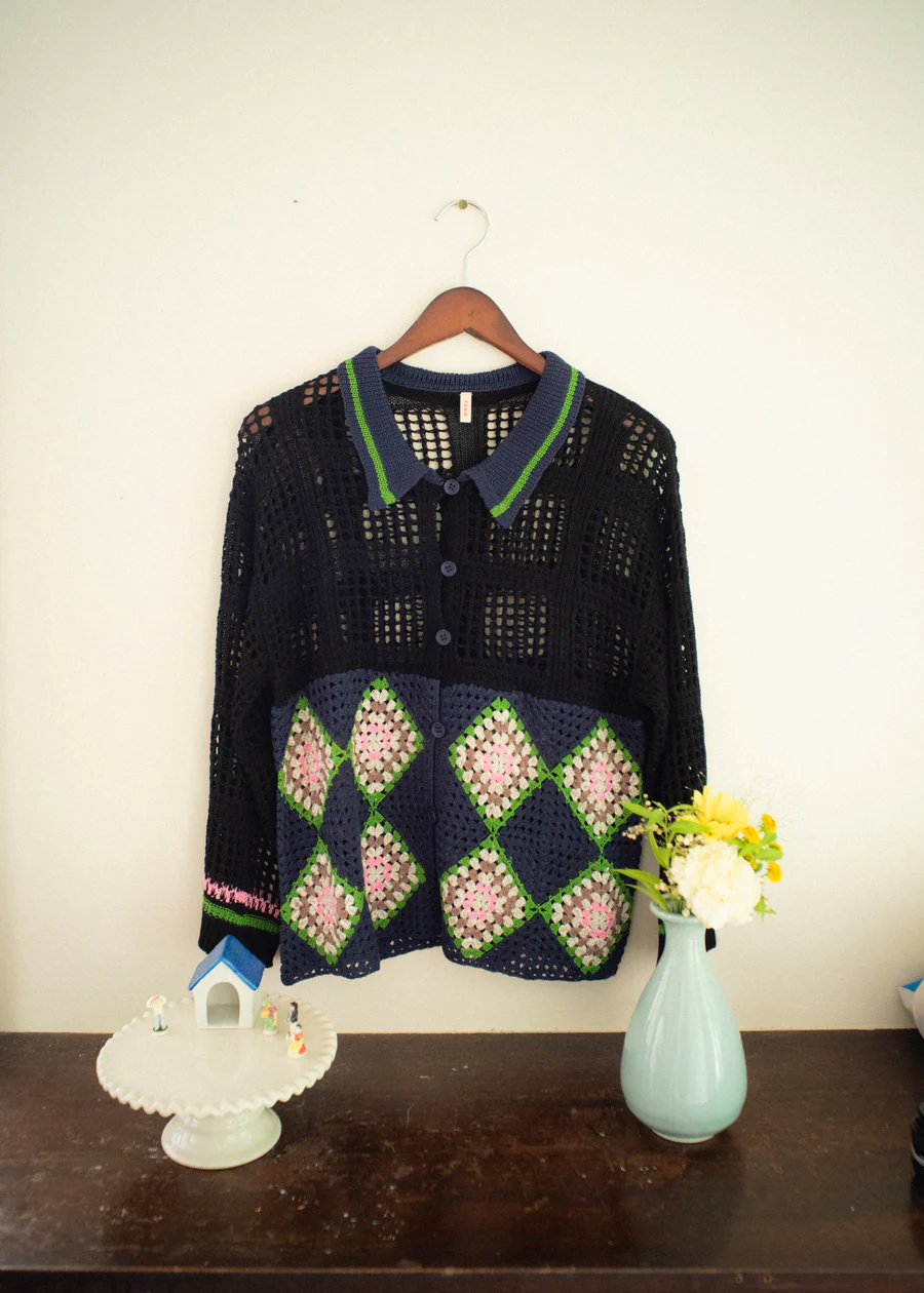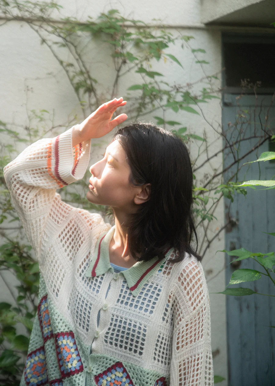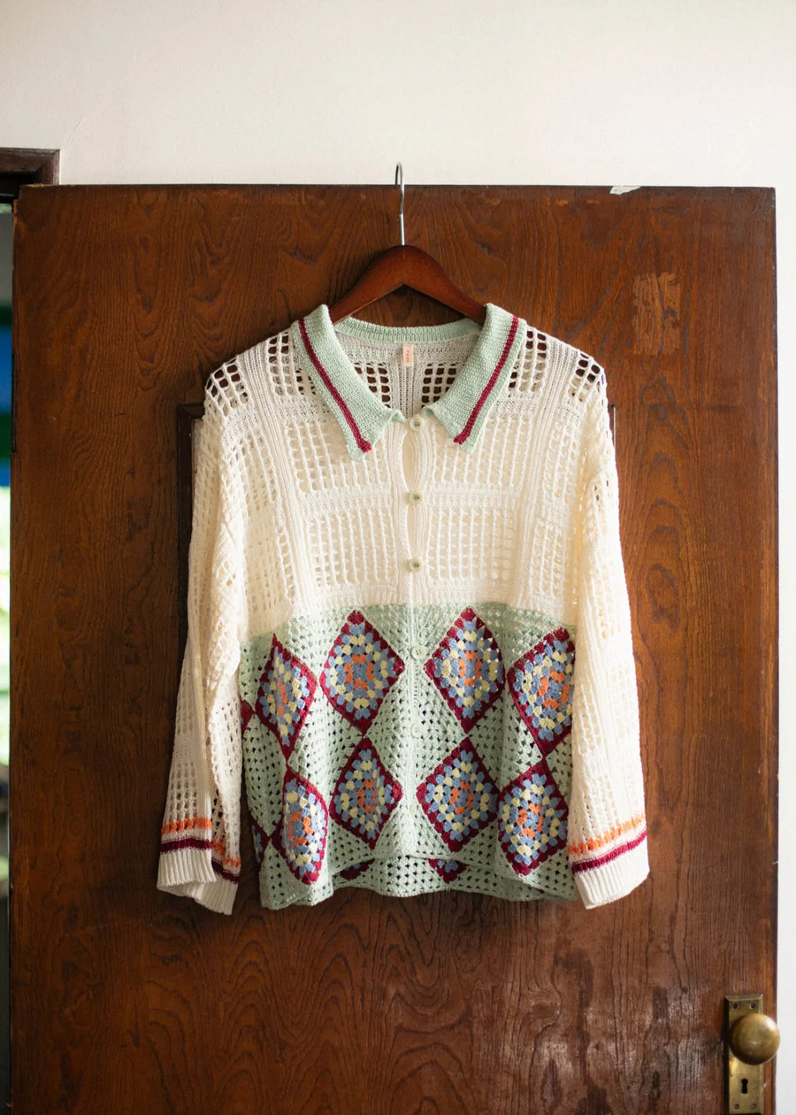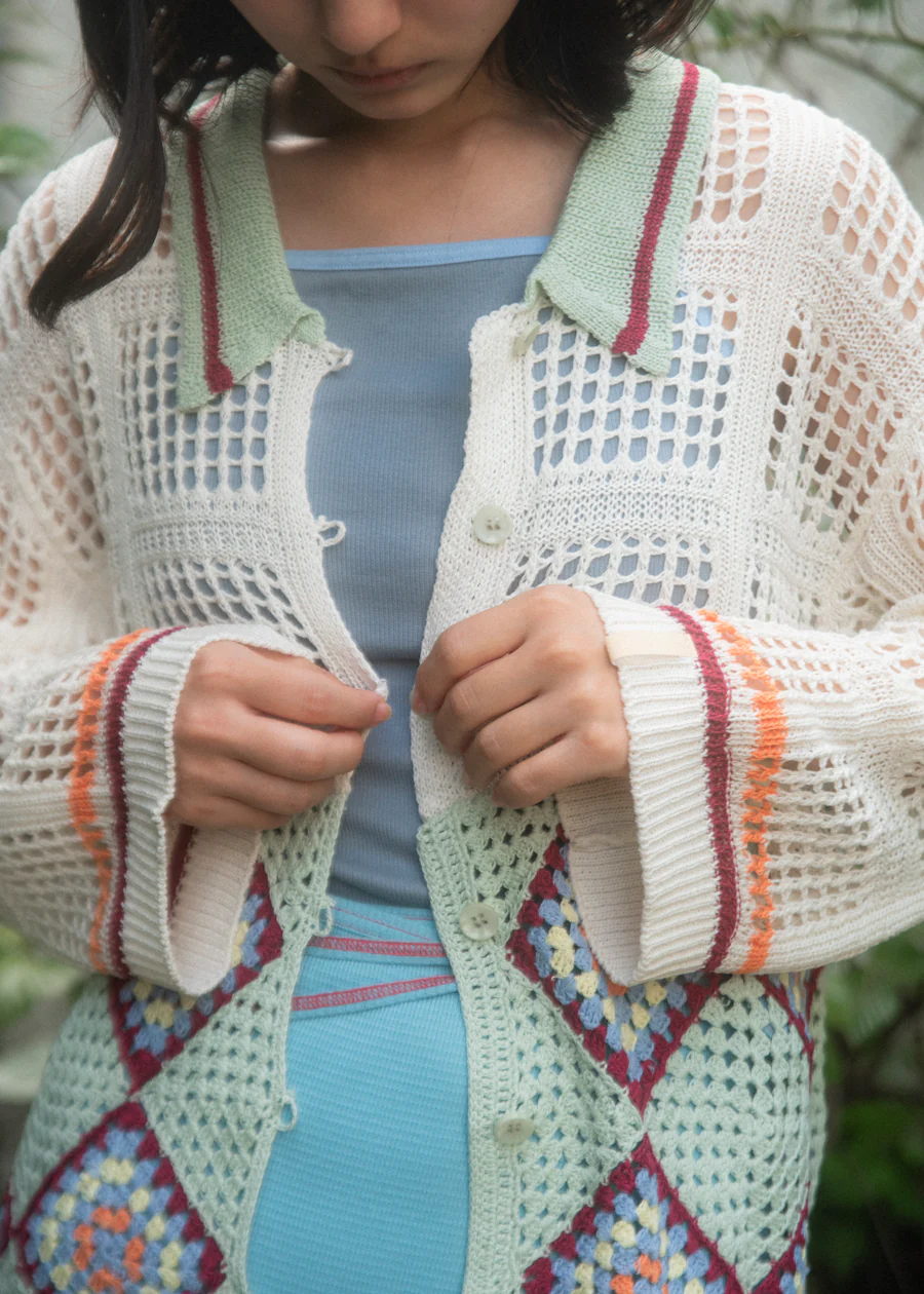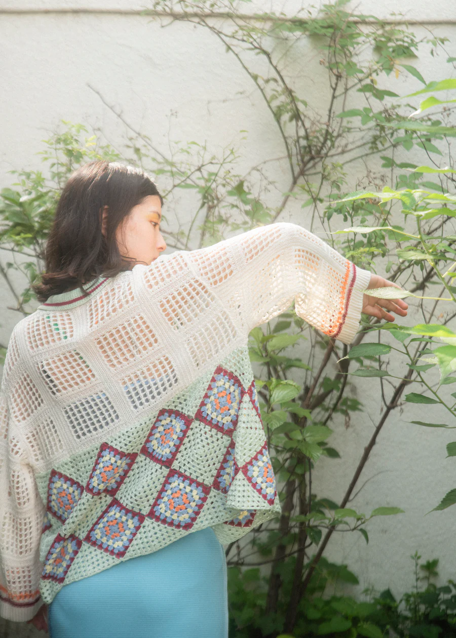 手工編織的花紋部分,輕盈透氣,開襟翻領設計,可以作為輕便外套穿著。