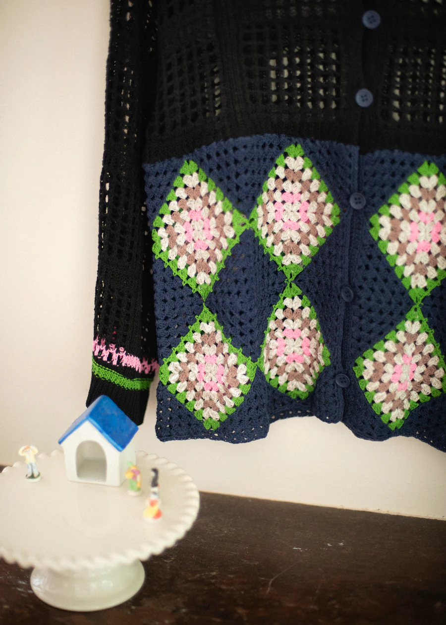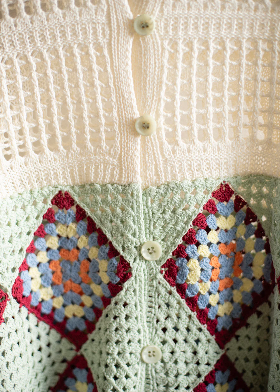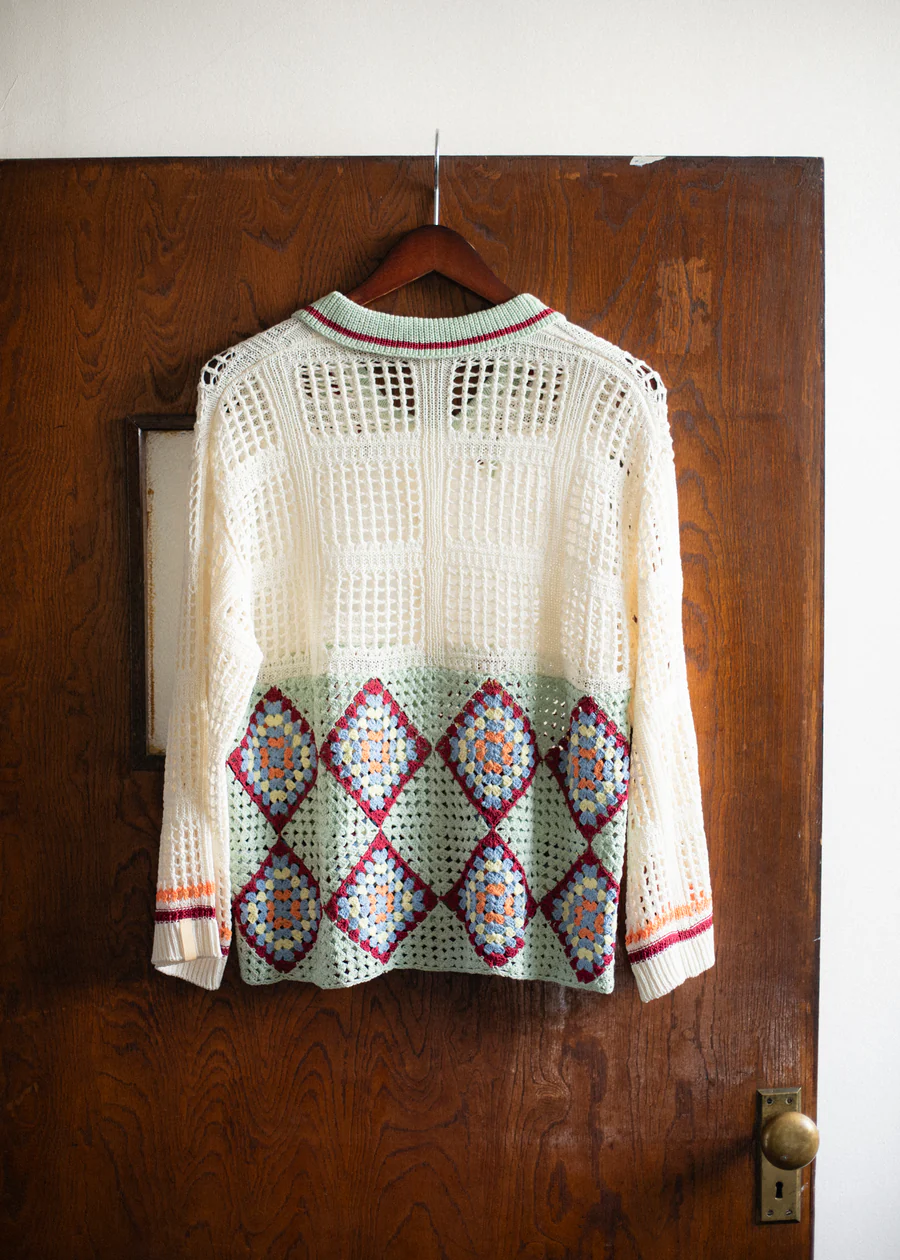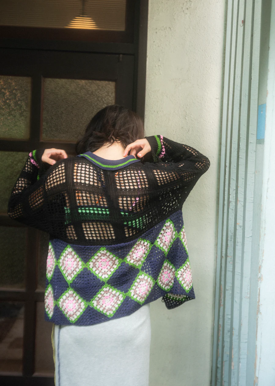 手工編織的花紋部分,輕盈透氣,開襟翻領設計,可以作為輕便外套穿著。