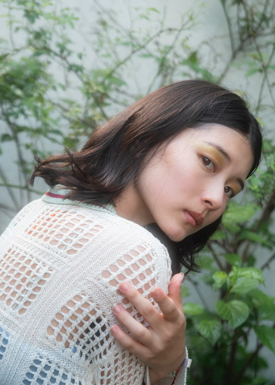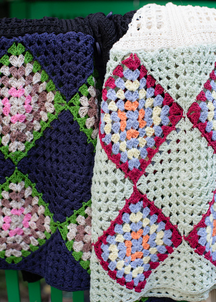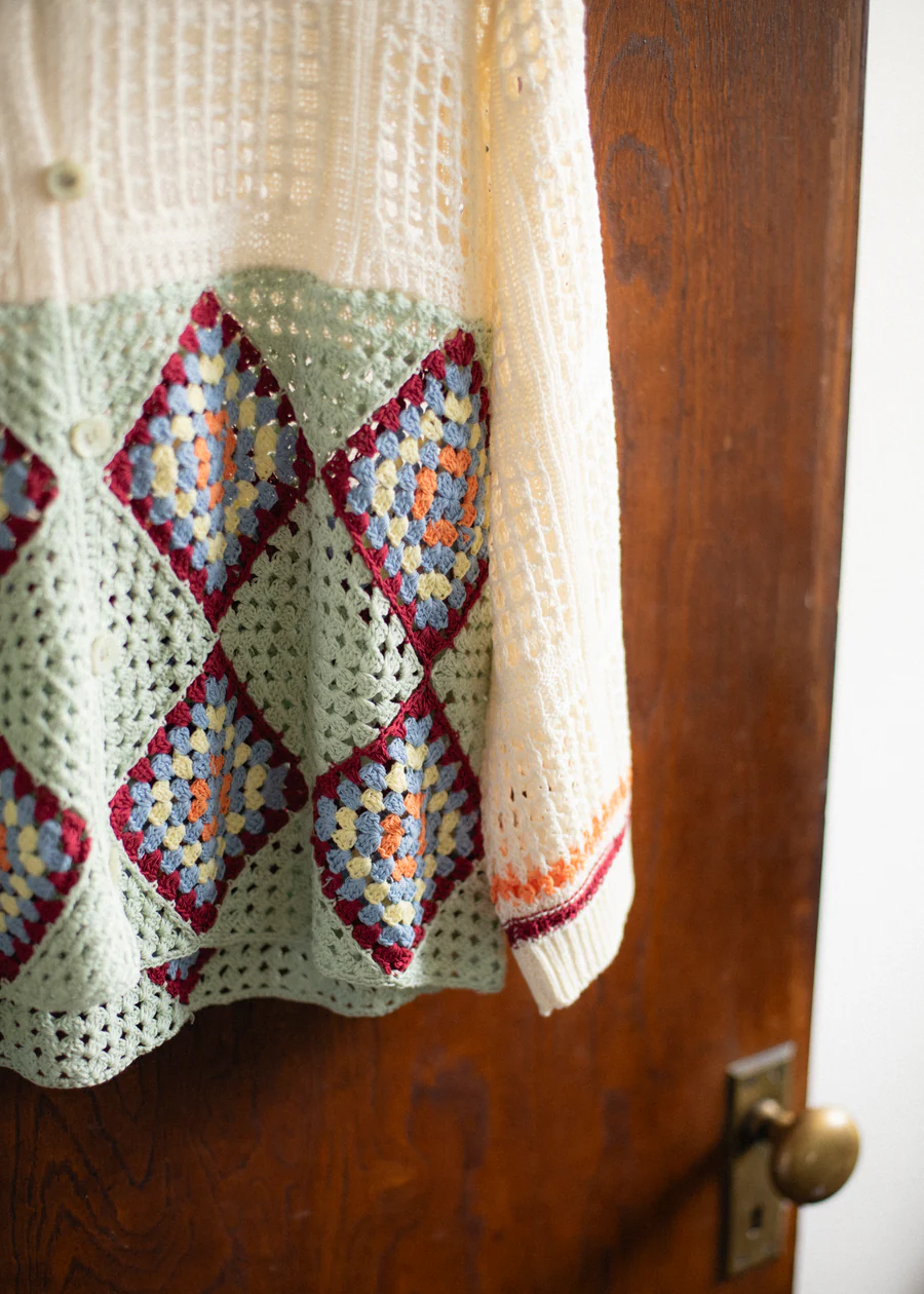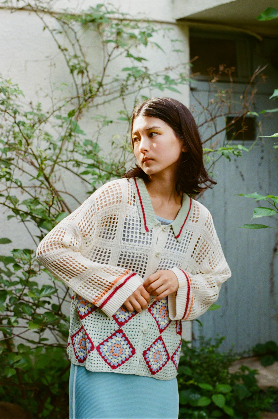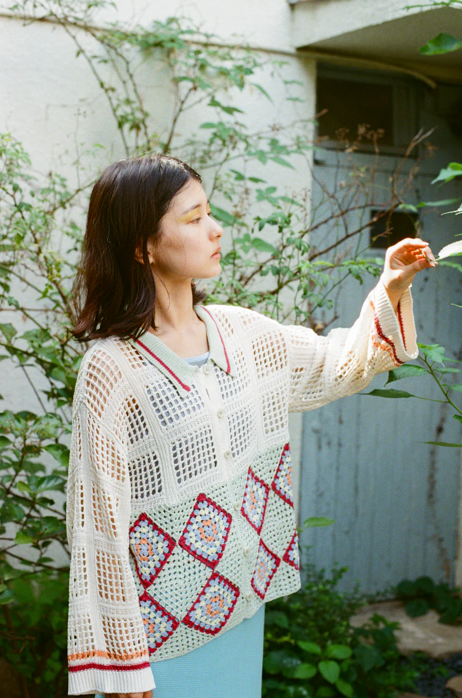 手工編織的花紋部分,輕盈透氣,開襟翻領設計,可以作為輕便外套穿著。