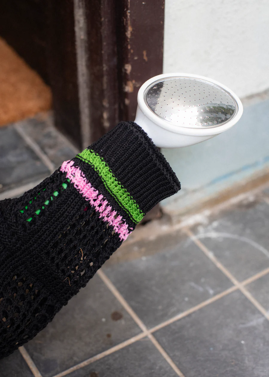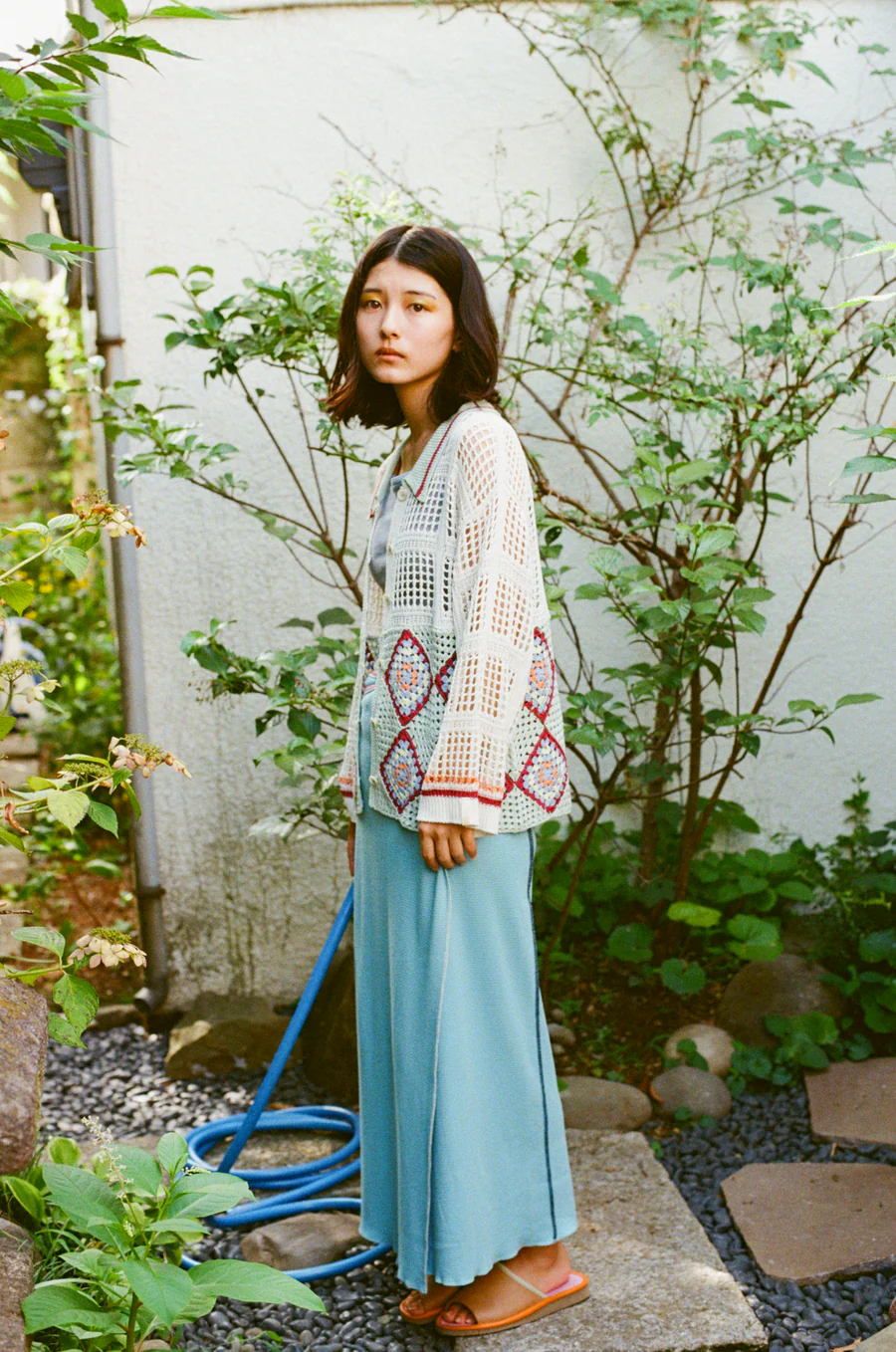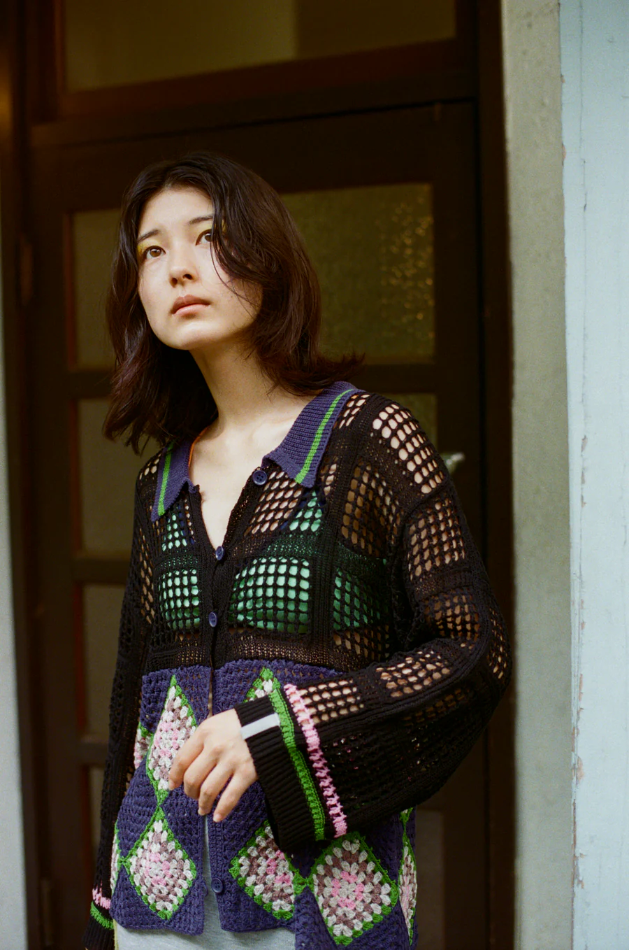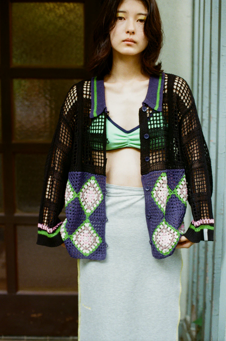 手工編織的花紋部分,輕盈透氣,開襟翻領設計,可以作為輕便外套穿著。
